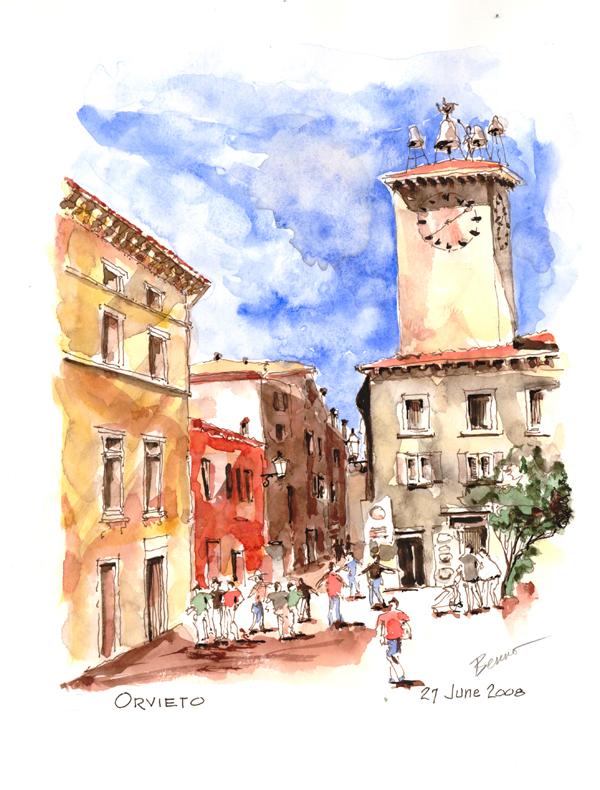 July12 - July 26, 2012 La Romita School of Art Terni in Umbria, Italy THE COURSE: Benno Philippson, architect and watercolorist, has developed a thoughtful system for showing you how to prepare to paint by examining and sketching the underlying structure of what you see, so that you are ready to complete larger works in the studio. His travel journals that he will share with you are jewels of plein air sketches, tiny watercolors, value and gesture studies as well as journal entries. In the richness of the Umbrian landscape, in a different location every day, Benno will support artists of a wide variety of skill levels to find their own way. Demos on perspective, composition and form, the figure in the painting, the use of light, color and scale will include techniques specifically for the traveler who wants to paint on site. Over two weeks the neophyte artist will find a way of seeing and capturing on paper that new understanding. The experienced artist will be supported into expanding personal directions in painting. The media of instruction will be pencil, ink and watercolor. Benno will share his own methods for journaling that include drawing and painting with anyone interested. Participants who prefer to work in acrylics or pastels will still find what Benno teaches to be of value. THE SETTING: The Italian hill towns of Umbria, beginning at La Romita located in the hills above Terni, 100 miles north of Rome THE SCHOOL: La Romita School of Art, a non-profit summer art school founded more than forty years ago, presents a series of two-week workshops from late spring until late October. Founded by Enza and Paola Quargnali, it is now run by Enza and her husband, Ben Benson. Edmund Zimmerman is the director on site. The setting is a former monastery renovated for its current use as an art school. Students typically come from the United States, Great Britain, Canada and Australia. All instruction is in English. MEALS: Almost all meals are included, with an occasional lunch in a town we are visiting for a full day. The La Romita chefs are superb, keeping very much to the Umbrian tradition for fine cuisine. A TYPICAL ITINERARY: [the actual plan may vary] Every day you go to a new place to draw and paint. Day 1 Arrival at the Rome international airport for transport as a group to Terni and La Romita Day 2 San Gemini (medieval hilltop jewel) Day 3 Carsulae (ruins of a Roman town) Day 4 Assisi (mystical home of St. Francis) Day 5 Orvieto (the incredible Cathedral) Day 6 Stroncone (classic walled town) Day 7 Cività di Banoreggio (a Rick Steves favorite) Day 8 Scheggino (riverside known for trout and truffles) Day 9 Todi (a favorite with US artists) Day 10 Labro (Aspills down the hill like frosting@) Day 11 Villa Lante (the perfect renaissance garden) Day 12 Perugia (capital of the Etruscan confederation) Day 13 Spoleto (home of the Festival of Two Worlds) Day 14 Valle San Martino (tiny, perched on a mountain top) Day 15 Morning departure Many of the towns are not on the tourist route, so you can see Italian country life in Umbria exactly as it takes place every day. COSTS: For 2012 each session is $3750. The cost includes room and almost all meals, all instruction and painting excursions. Airfare is not included. BENNO PHILIPPSON: A SHORT BIO Benno graduated from the University of Illinois with a bachelor's degree in architecture, a master's degree in urban planning and nearly enough credits in art for a second major. He has been drawing and painting since childhood, ever since he could hold a pencil or a brush. His works are held in private collections in the United States, Europe, Great Britain, New Zealand and Japan. He has taught art to architecture students and has taught third graders about architecture each spring in the Architecture in the Schools program in Portland, Oregon. He regularly shows his work at the Village Gallery of Arts in Portland and has shown in group and one man shows in the Pacific Northwest for more than three decades. He is a life member of Oregon Watercolor Society. Benno is organized, systematic, relaxed, gentle in his critiques and generous with his time and experience. A past participant at La Romita, he was delighted to join the teaching faculty for 2008 and also 2010. CONTACT INFORMATION: E. Benno Philippson E-mail: bennophilippson@gmail.com Telephone: 503 644 4488 1610 NW 133rd Ave. Portland Oregon 97229 La Romita School of Art, Inc. PO Box 58219 Washington DC 20037 www.laromita.org 1 855 476 6482